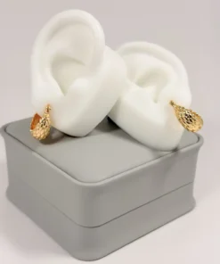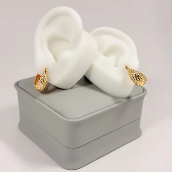 Los Aretes Candonga Mini Gruesa Escamada Dorada | Colección Cerchio | Oro Laminado 18K están elaborados en oro laminado 18K garantizado. Su superficie está cubierta por un patrón de escamas superpuestas que imitan la textura de piel exótica, creando un relieve orgánico que atrapa la luz en múltiples direcciones. Cada escama refleja un destello diferente, dándole a la pieza un brillo dinámico y texturizado que la distingue de cualquier candonga lisa. Forma gruesa y abombada en tamaño mini — máxima expresión con mínimo espacio.