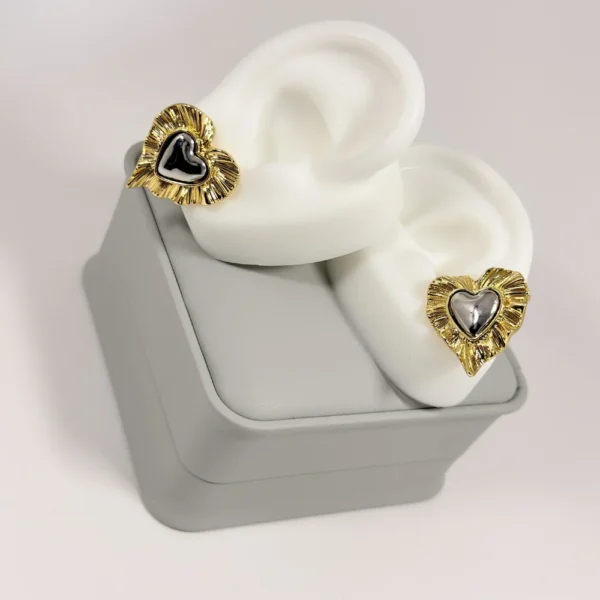 Los Aretes Topo Corazón Radiante Bicolor de nuestra Colección Magna están elaborados en oro laminado 18K garantizado. Su diseño en forma de corazón con centro plateado abombado y marco dorado con textura de rayos crea un efecto visual deslumbrante que irradia elegancia y romanticismo. Una pieza que habla sin palabras.