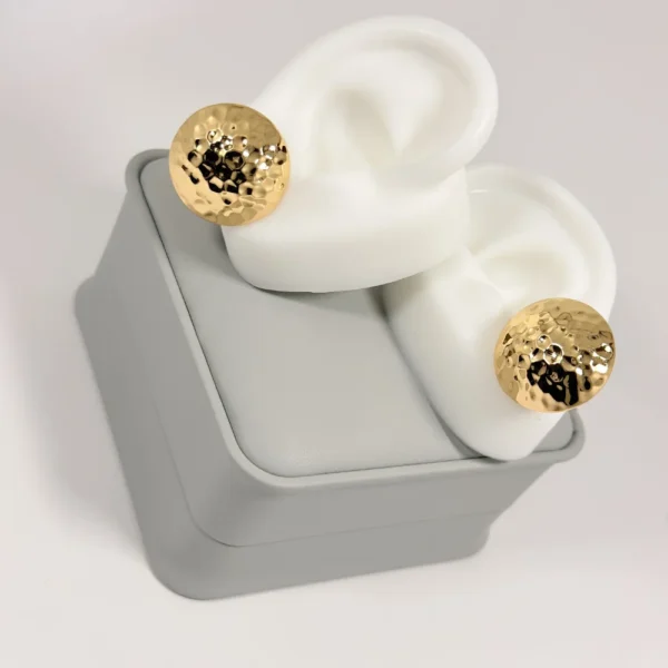 Los Aretes Topo Domo Martillado de nuestra Colección Magna están elaborados en oro laminado 18K garantizado. Su forma de domo con acabado martillado a mano crea un efecto de luz irregular y fascinante que convierte un diseño simple en una pieza con personalidad. Livianos y cómodos para el uso diario sin renunciar al estilo.