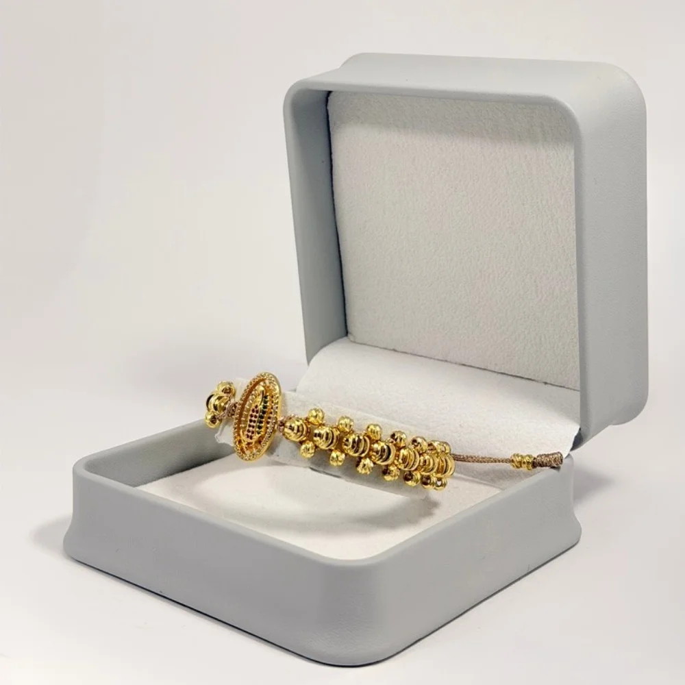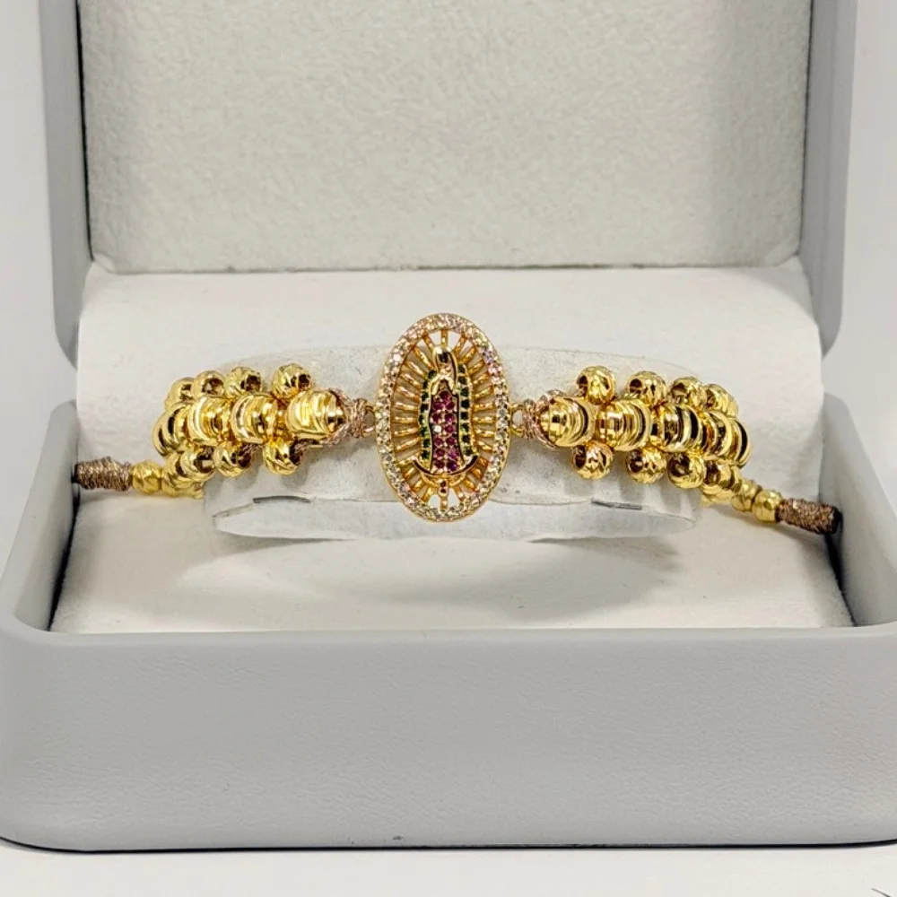 Pulsera Tejida | Virgen de Guadalupe | Oro Laminado 18K | Color Beige Perlado.